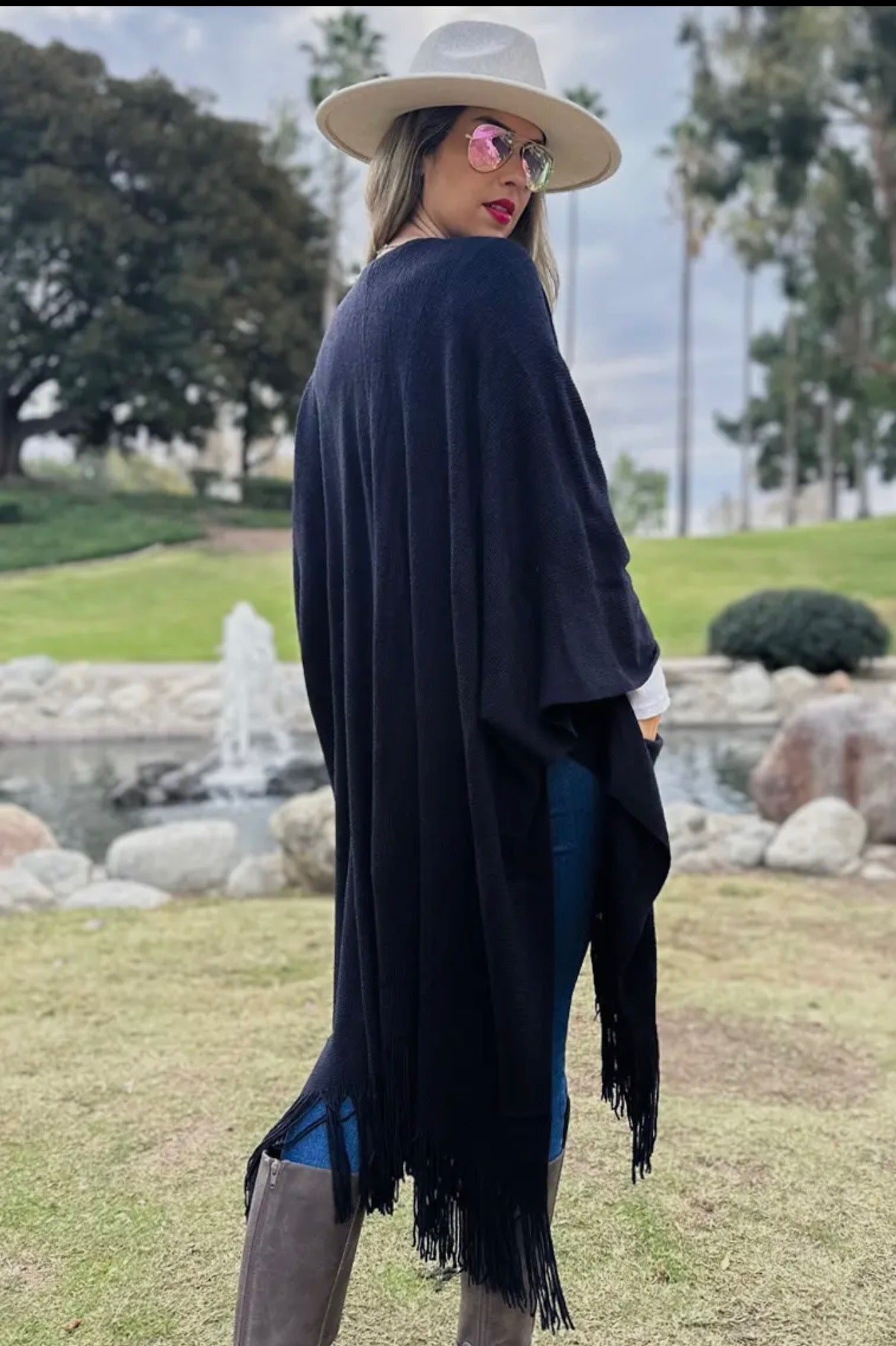 Wrap yourself in cozy charm with this black soft knitted kimono cardigan. Featuring handy pockets, elegant fringe & open front, it's perfect for layering and adding a playful touch to any outfit. Whether you're lounging or out and about, this cardigan brings both comfort and style together with a fun, relaxed vibe.